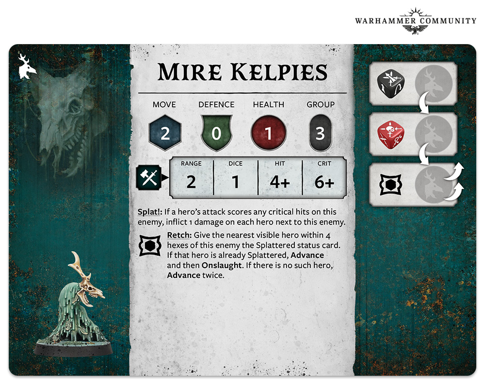 All this talk of attacking and we’ve still not looked at an enemy card. Heroes and enemies make alternate activations in Darkwater, so even small groups can be deadly. Here’s the humble Mire Kelpie as an example.