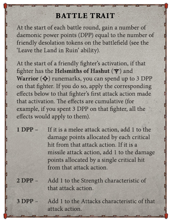 The Helsmiths of Hashut retain their signature daemonic power points as a Battle Trait, letting a model with both the Helsmiths of Hashut and Warrior runemarks bolster the damage applied on critical hits, as well as their Strength and Attacks characteristic.