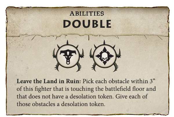 Leave the Land in Ruin: Pick each obstacle within 3” of this fighter that is touching the battlefield floor and that does not have a desolation token. Give each of those obstacles a desolation token.