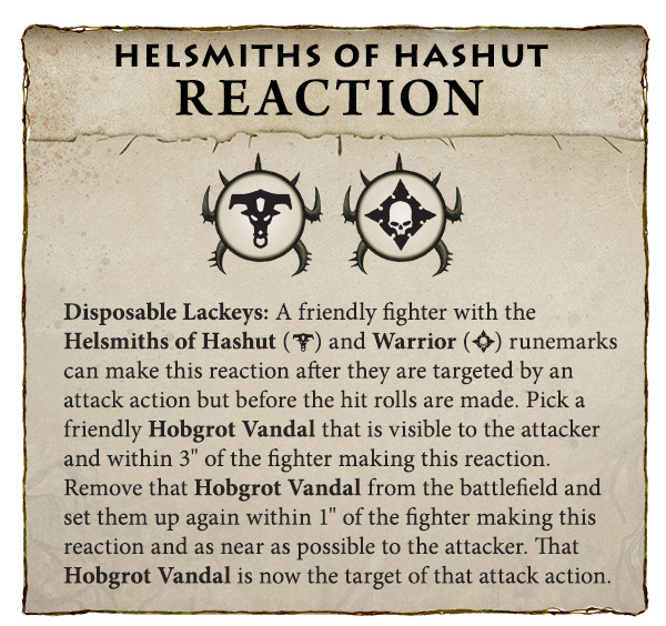 Disposable Lackeys: A friendly fighter with the Helsmiths of Hashut and Warrior runemarks can make this reaction after they are targeted by an attack action but before the hit rolls are made. Pick a friendly Hobgrot Vandal that is visible to the attacker and within 3" of the fighter making this reaction. Remove that Hobgrot Vandal from the battlefield and set them up again within 1" of the fighter making this reaction and as near as possible to the attacker. That Hobgrot Vandal is now the target of that attack action.