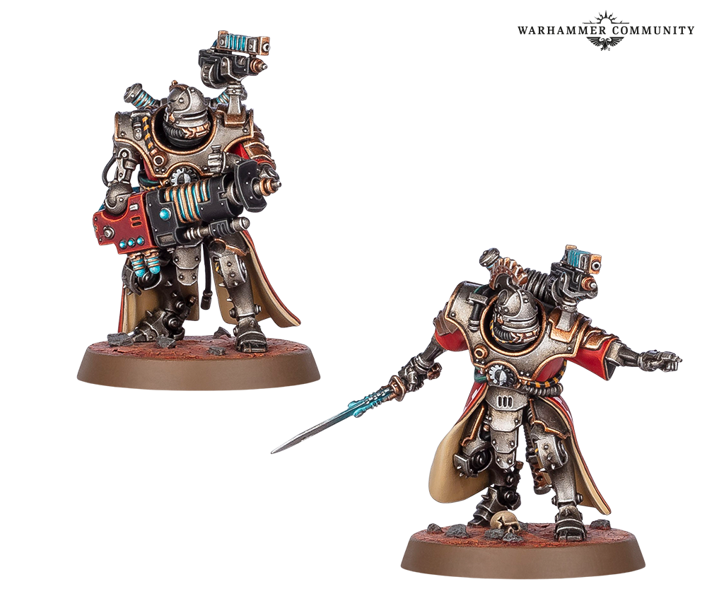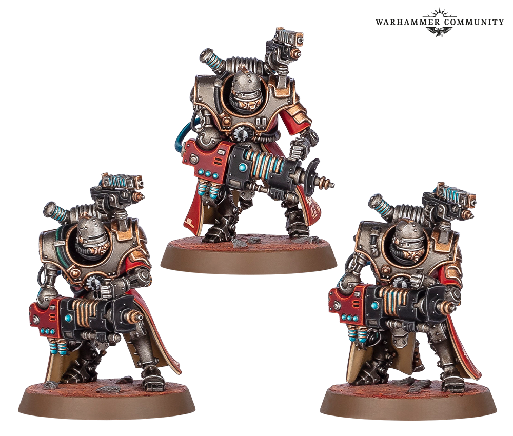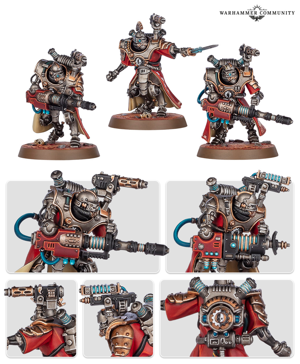Hastarii are a vital element of the Skitarii macro-clades that combine the heavy firepower of much larger machines with armoured cyborg bodies modified to carry such destructive weapons on the front lines. Their right arms are replaced with gyroscopically stabilised gun mounts wired directly into their cortical circuits, giving them uncanny accuracy at the cost of needing advanced backpack generators that are as heavy as they are difficult to manufacture.