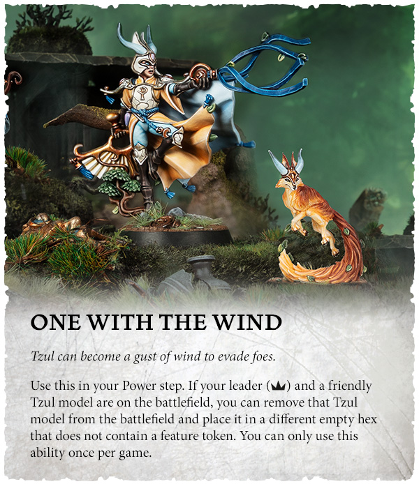 Use this in your Power step. If your leader and a friendly Twul model are on the battlefield, you can remove that Tzul model from the battlefield and place it in a different empty hex that does not contain a feature token. You can only use this ability once per game.