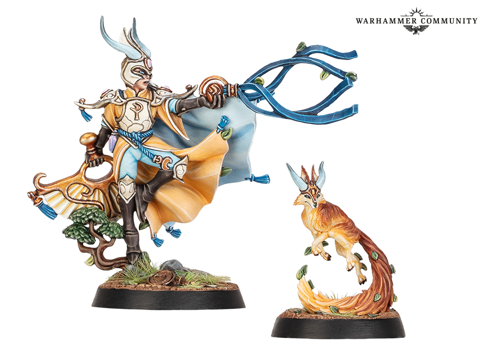 This new warband brings the masters of anemology* from the Hurakan temples of Hysh to the heart of Embergard. Thyrielle’s Zephyrites are a Mastery warband consisting of four Lumineth Realm-lords and their vulpine spirit companion, Tzul. The twist is that Tzul isn’t a fighter – it’s a token, whose placement on the board will determine the reach of the warband’s abilities.