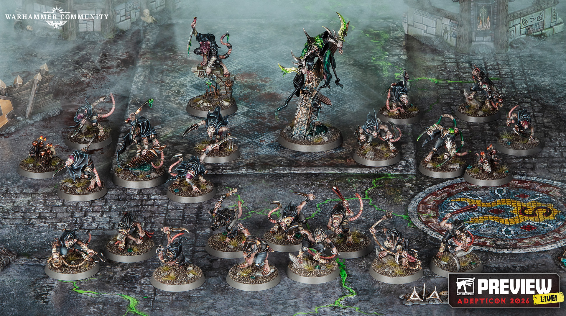 Since the Vermindoom, many of the Skaven Clans have been blessed by the Great Horned Rat with reinforcements, but Clans Eshin have been conspicuous by its absence. Fortunately, skulking in the shadows and making plans is where they excel, and now they are ready to emerge. The bold and vicious Deathmaster Crixxit leads an additional Deathmaster, 10 Gutter Runners, 10 Night Runners, and a pair of bomb rats* to hunt their human prey through the streets.