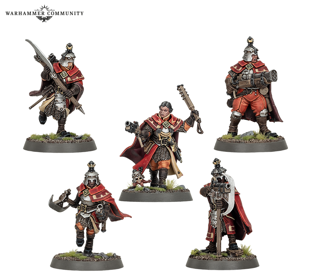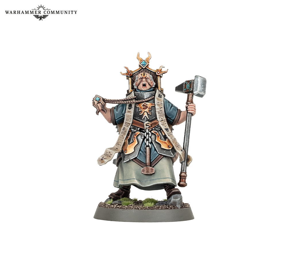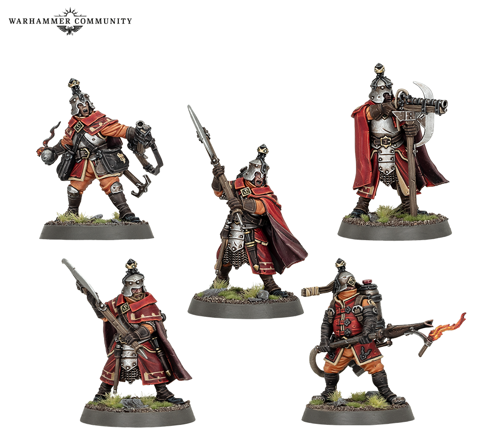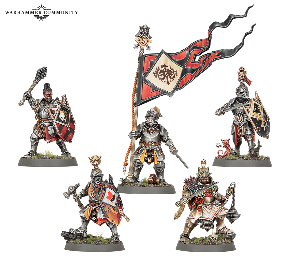 With him march a band of valiant Freeguild Gallants who strap on heavy armour and shields to hold ground until their last breaths, a unit of elite Freeguild Grenadiers equipped for close-quarters combat with powerful firearms and heavy bardiches, and a devout Mallus Forgepriest whose inspiring sermons consecrate corrupted ground.**