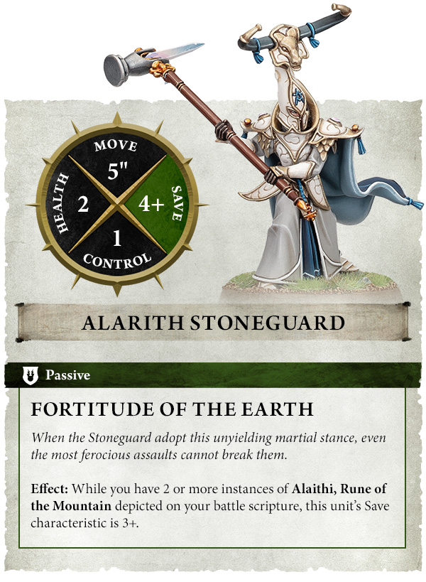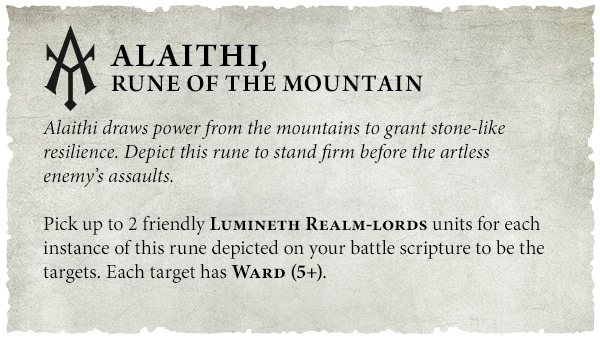 Effect: While you have 2 or more instances of Alaithi, Rune of the Mountain depicted on your battle scripture, this unit’s Save characteristic is 3+.