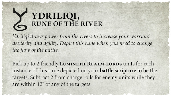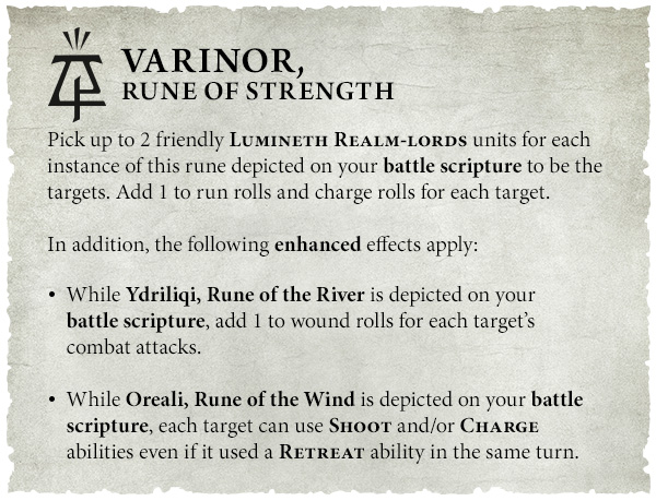 Pick up to 2 friendly Lumineth Realm-lords units for each instance of this rune depicted on your battle scripture to be the targets. Add 1 to run rolls and charge rolls for each target.