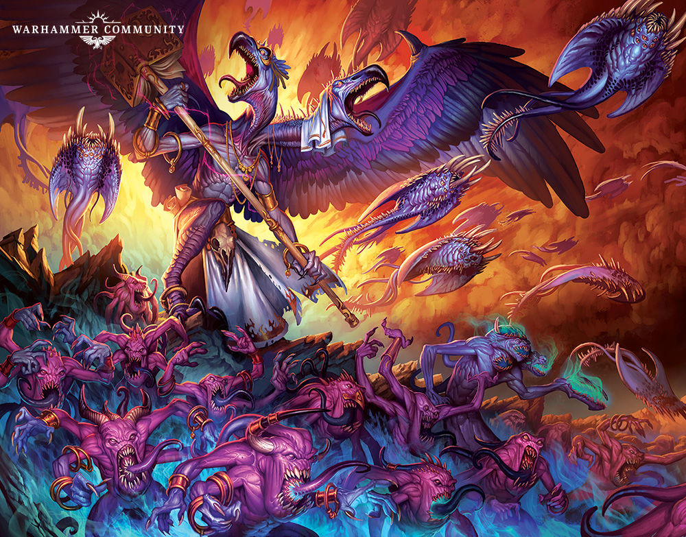 The Fateweaver’s twin heads clack and chatter as he watches his infernal footsoldiers driven into the dirt, their lumpen bodies bursting apart in a spray of flames and lurid colours.