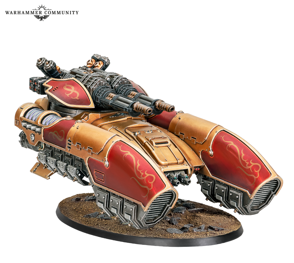 Built on the same frame as the workhorse Fellblade tank, the Glaive is a rare variant that mounts a gigantic volkite carronade to reduce entire squads of hardened troops to scorched ash. This immense gun burns right through power armour like it isn’t there, making the Glaive a terror to massed deployments of the Legiones Astartes – Loyalist or Traitor.