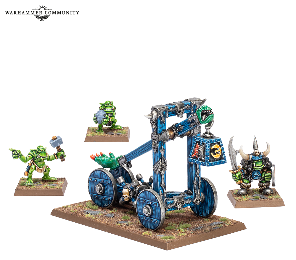 You can also get a pack of five Black Orcs for them to fight alongside; a three-model Orc Boyz Command team with musician, champion, and standard bearer; a unit of 10 Orc Boyz with a variety of weapons; and a Goblin Rock Lobber with three crew to add artillery support. All of these miniatures are cast in metal, with the exception of plastic shields on several of the models.