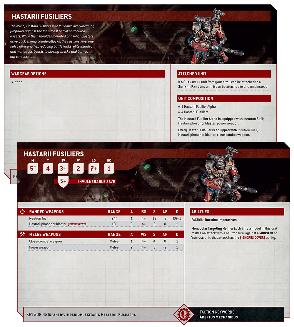 A 3+ armour save, 5+ invulnerable save, and 2 Wound statline makes these cyborg gunners surprisingly tough, especially when holed up in dense terrain that the larger Adeptus Mechanicus vehicles struggle to move around in. They can also assist each other in a pinch, as the Exterminators carry a shoulder-mounted arc blaster with [ANTI-VEHICLE 4+] while Fusiliers pack a phosphor blaster that burns through cover.
