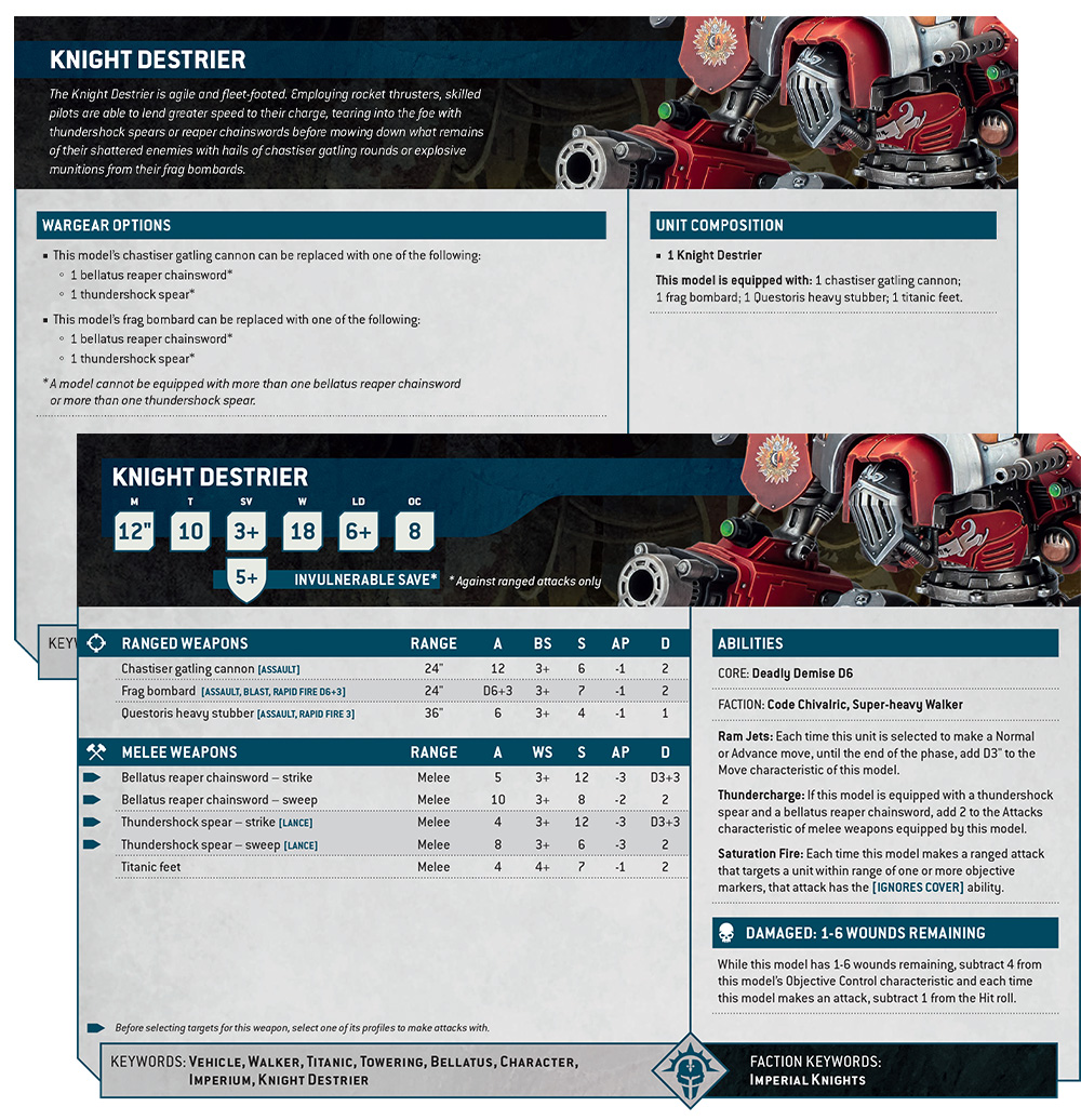 These Knights have a flexible arsenal, coming armed with a chastiser gatling cannon and frag bombard as standard, and one or both of these devastating ranged weapons can be swapped for a melee weapon. Better still, springing for the full throttle melee approach with both the thundershock spear and Bellatus reaper chainsword gives you extra close combat attacks, so the Destrier excels no matter what range you want to engage your enemies at.
