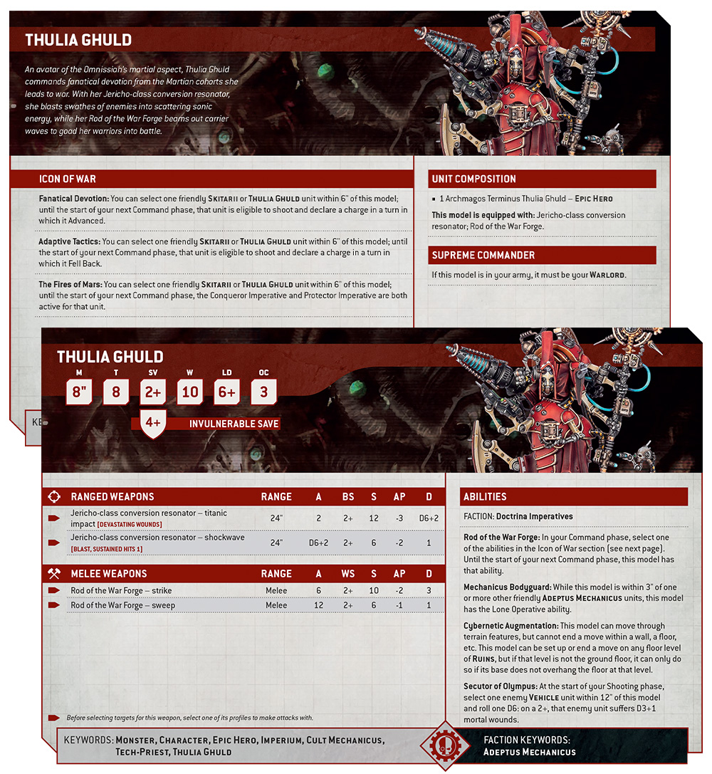 The Rod of the War Forge isn’t just a powerful melee weapon, either – it also serves as a symbol of her absolute authority over the Skitarii legions, and can buff them with one of three useful effects. This makes her the perfect leader for a force with loads of Rangers, Vanguard, and Hastarii, while the Mechanicus Bodyguard ability means it’s safe to throw her right into the thick of things without worrying about being picked off by your enemy’s big guns.