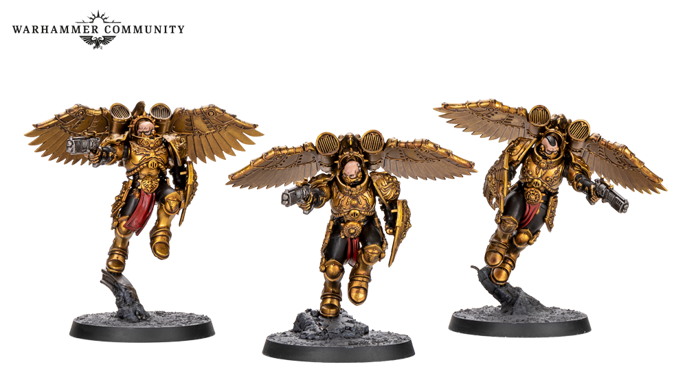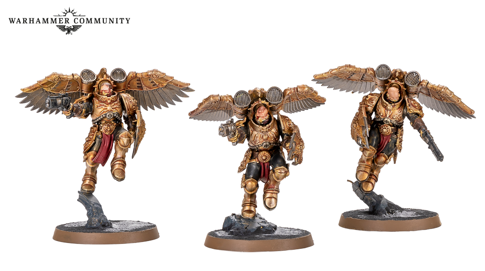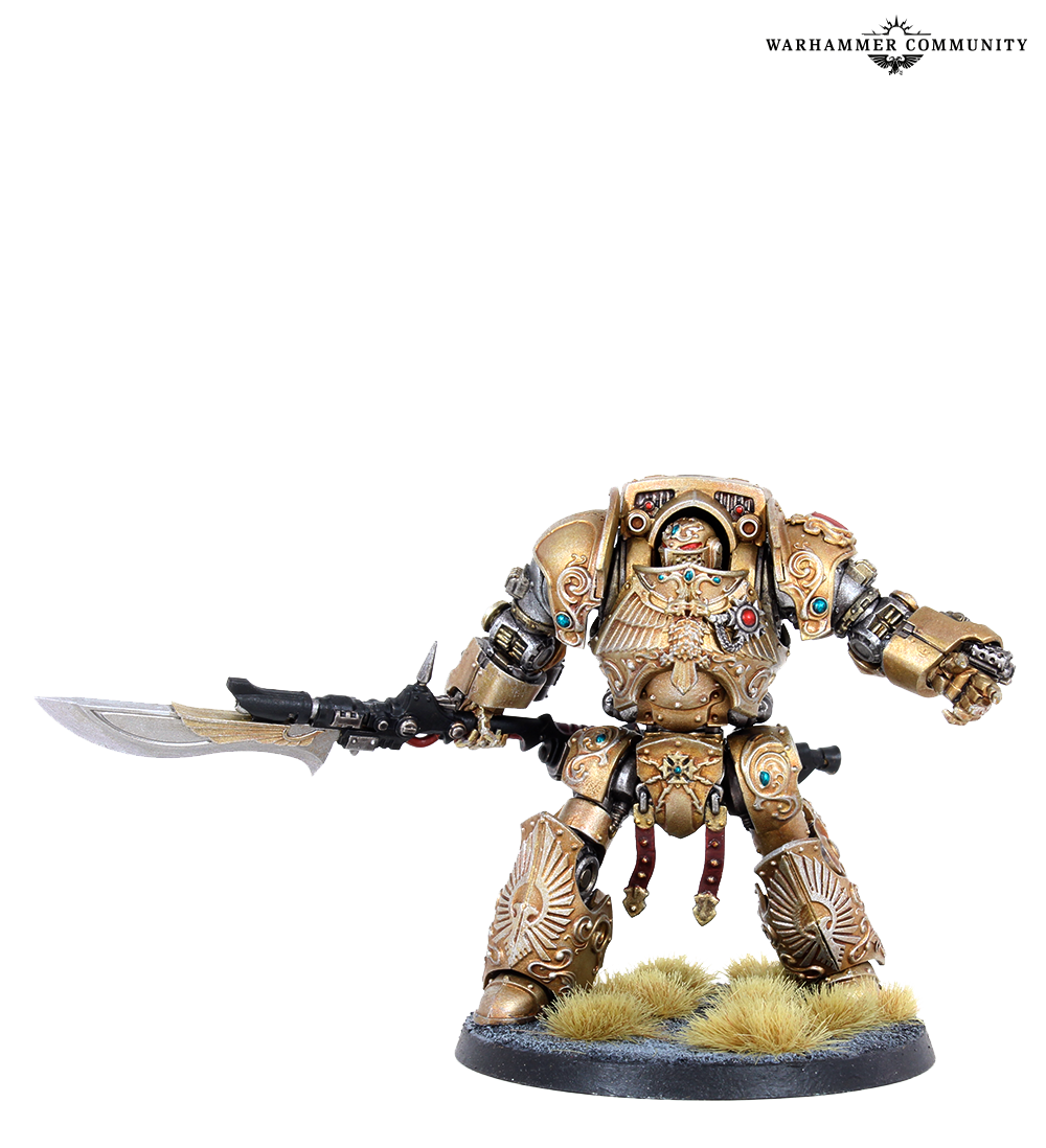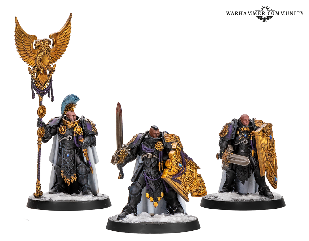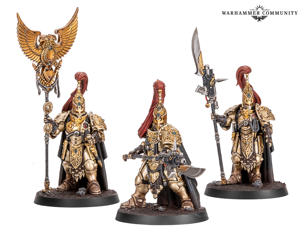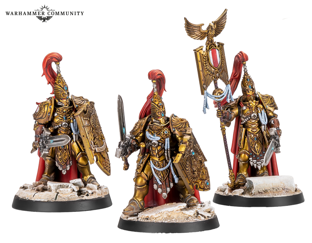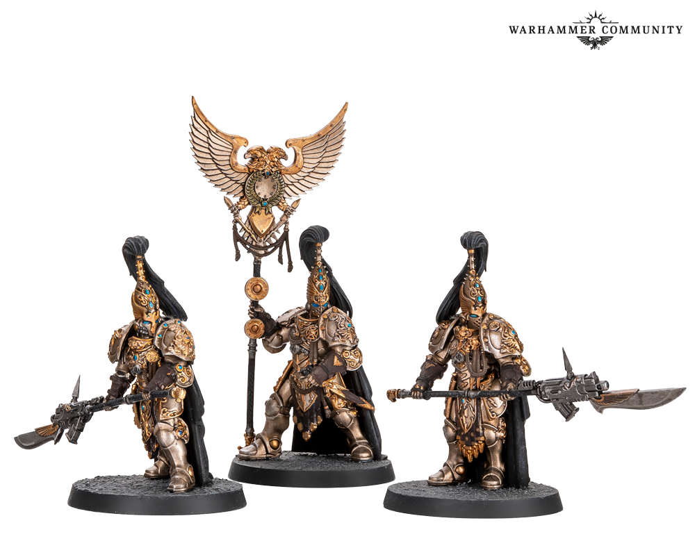Sentinel Guard swap their guardian spears for nimble warblades and thick praesidium shields, becoming durable powerhouses even more resistant to damage than regular Custodians. These examples from Ben L, Ben P and Thomas show that gold never goes out of style.