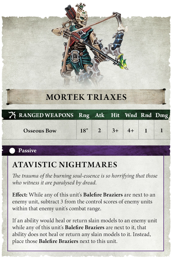 For every 10 Mortek Triaxes in a unit they are accompanied by two three-legged Balefire Brazier. If all of the Triaxes’ shots target the same unit they can place a Balefire Brazier token next to that unit, to denote the trauma of the burning-soul essence that wreathes their arrows. This harrowing ethereal flame causes its targets to suffer Atavistic Nightmares, reducing their control scores by 3, an effect which also spreads to enemies within 3” of them. Only healing abilities can extinguish the flames, at the expense of healing the unit or returning slain models.