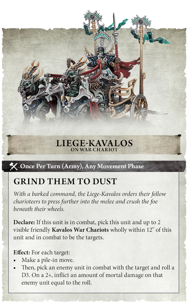 The Liege-Kavalos are some of the greatest commanders in the Bonereapers forces, and the introduction of terrifying War Chariots gives them even more scope to race around the battlefield and ensure their orders are observed to the letter. Each Liege-Kavalos on War Chariot is a Masterful Charioteer, able to undertake swift defensive manoeuvres that make them even harder to hit, granting them Ward (5+). By following their command, up to two nearby Kavalos War Chariots are also granted the ward, so three-pronged assaults are common.