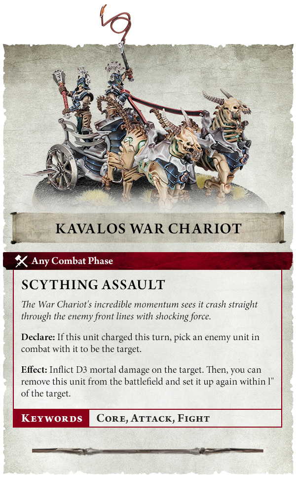 An order to Grind Them to Dust enables the Liege-Kavalos and two fellow charioteers to make a pile-in move during the movement phase, in addition to dealing mortal damage. The War Chariots themselves are designed to perform a Scything Assault, dealing damage when they charge into enemy units, whilst also crashing through defensive lines (represented by removing the model and setting up in combat again). They also unleash Pinning Attacks with their javelins, represented not by a weapon profile, but an ability that activates on a roll of 3+, dealing 1 mortal damage and preventing the targeted unit from making pile-in moves for the rest of the turn.