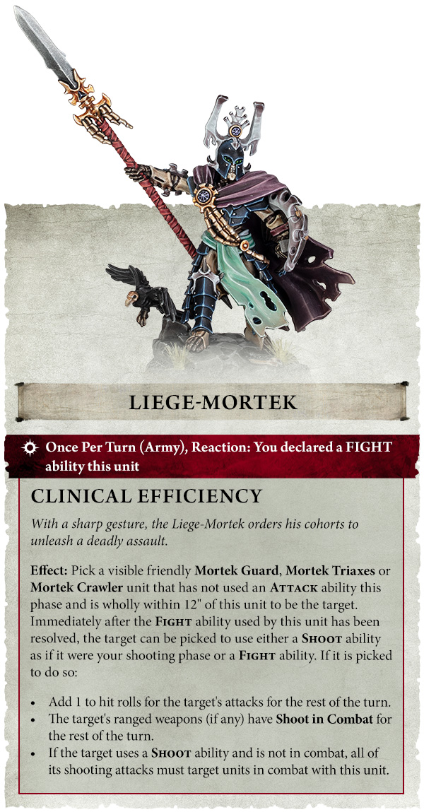 Effect: Pick a visible friendly Mortek Guard, Mortek Triaxes or Mortek Crawler unit that has not used an ATTACK ability this phase and is wholly within 12" of this unit to be the target. Immediately after the FIGHT ability used by this unit has been resolved, the target can be picked to use either a SHOOT ability as if it were your shooting phase or a FIGHT ability. If it is picked to do so: