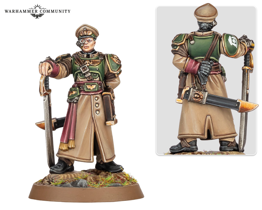 The sculpted terrain base has her standing on broken rubble and a discarded sandbag, while she holds the strap of her scabbard and a glove behind her back. Picture perfect for leading your Cadians to victory, or as an officer in your regimental Command Squad.