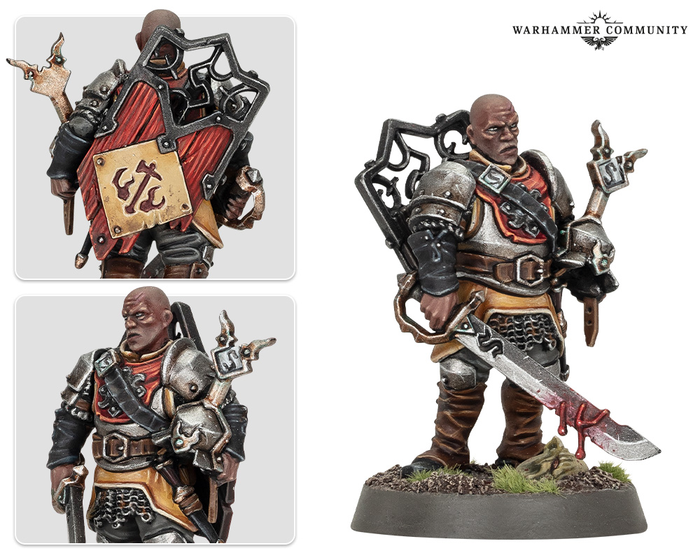 This weary Sergeant-at-Arms from the Cities of Sigmar has fresh blood still dripping from his heavy blade as he casts an eye over a recent battle. His arms and armour are chipped and worn – hallmarks of a gruelling campaign – and the decapitated head of an unfortunate Kruleboy lies at his feet half-buried in the dirt.