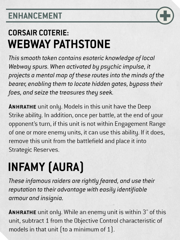 Corsair Enhancements show off just how elite these pirate crews are by giving whole units a boost fit for a Character. The Webway Pathstone gives any one Anhrathe unit Deep Strike – which can only result in delightful shenanigans – while Infamy makes even rank-and-file troops a dab hand at stealing objectives out from under those who deserve them less.