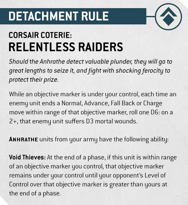 Yeah, the Relentless Raiders rule makes it a real pain charging into one of the Corsairs’ held objectives, and since they hold onto strategic locations without needing to be there in person, you can play a great game of cat-and-mouse as enemy forces blow themselves up chasing you between objectives.