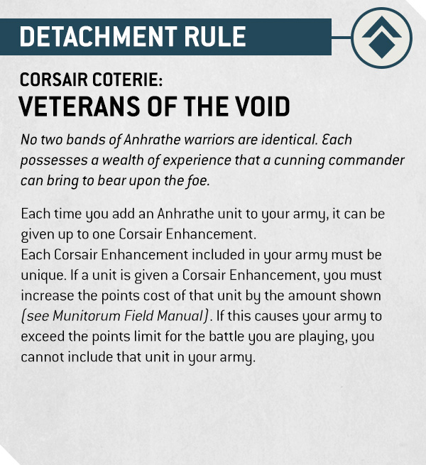Each Corsair Enhancement included in your army must be unique. If a unit is given a Corsair Enhancement, you must increase the points cost of that unit by the amount shown (see Munitorum Field Manual). If this causes your army to exceed the points limit for the battle you are playing, you cannot include that unit in your army.