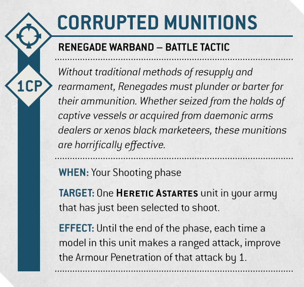 Without traditional methods of resupply and rearmament, Renegades must plunder or barter for their ammunition. Whether seized from the holds of captive vessels or acquired from daemonic arms dealers or xenos black marketeers, these munitions are horrifically effective.