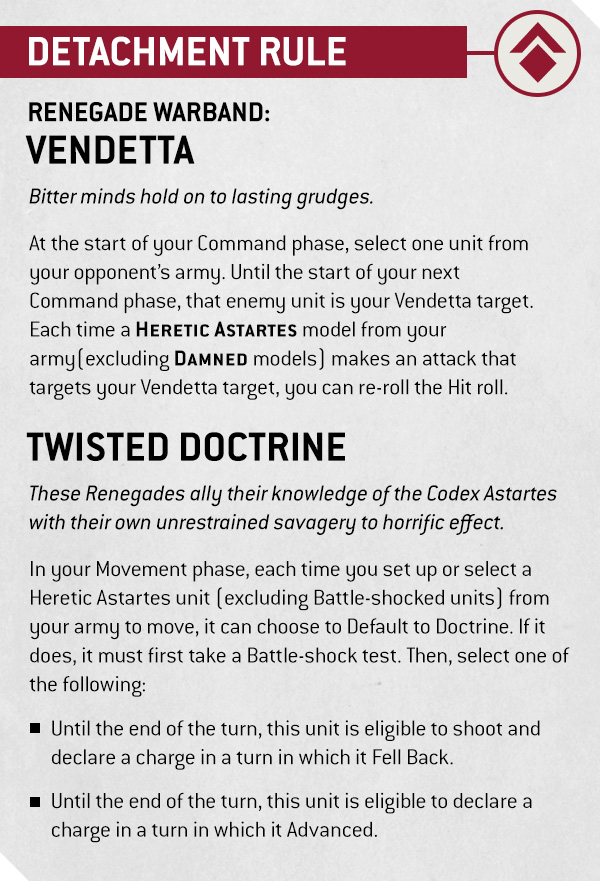 Command phase, that enemy unit is your Vendetta target. Each time a HERETIC ASTARTES model from your army(excluding DAMNED models) makes an attack that targets your Vendetta target, you can re‑roll the Hit roll.