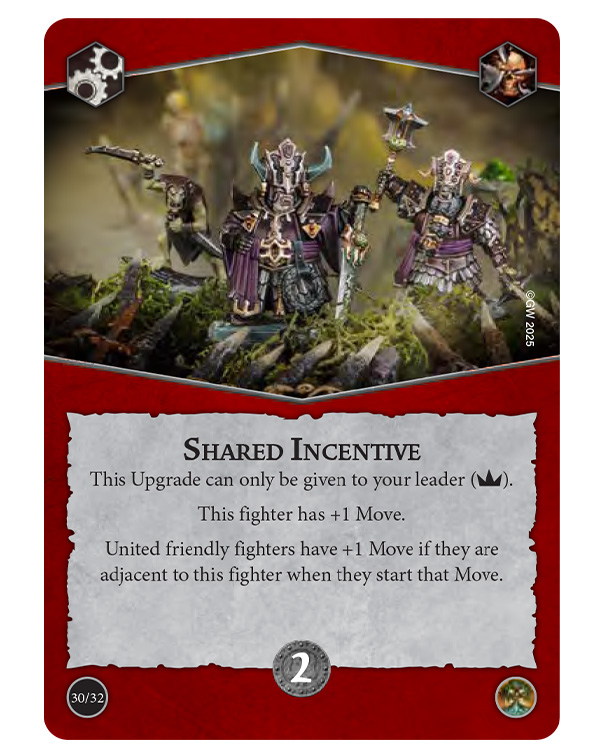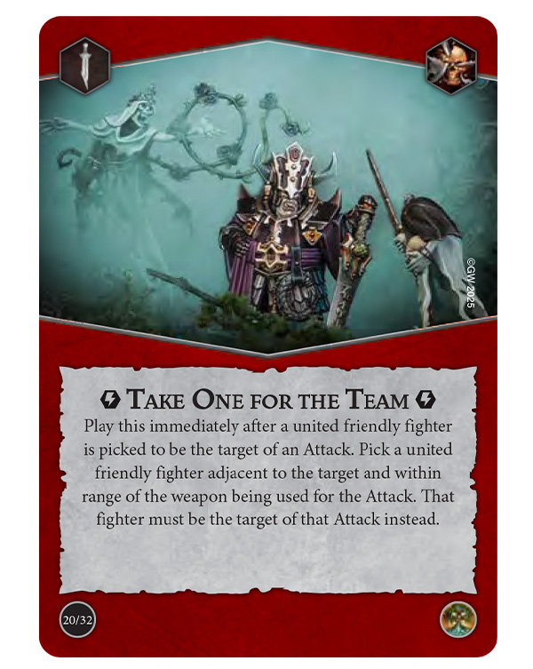United fighters can Take One For The Team, diverting an incoming Attack to themselves, or present a Unified Front and gain +1 Save in the next turn, to a maximum of 3. Leaders can be upgraded with Shared Incentive to get +1 Move, which united fighters also pick up if they start their move adjacent to the leader.