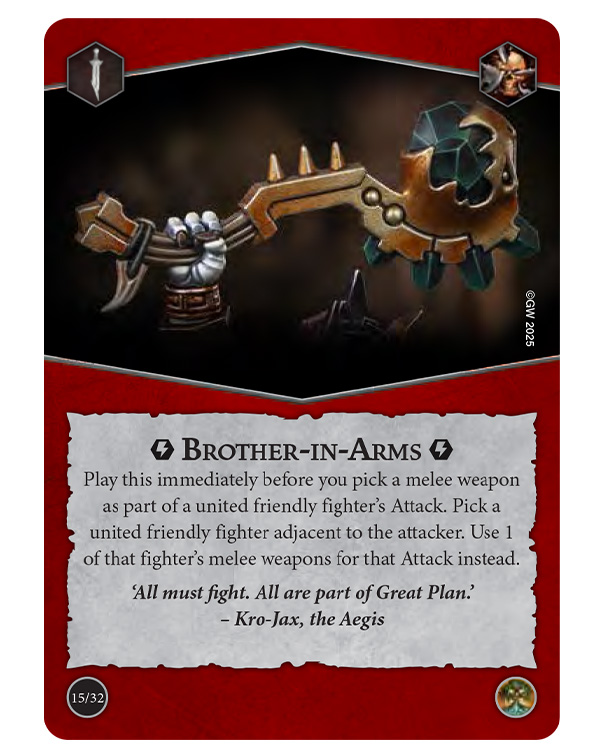 A Brother-in-Arms can pick the melee weapon of an adjacent friendly fighter when making an Attack, perhaps making use of the Entangling Strike upgrade weapon that gains Cleave and Ensnare when their target is Flanked or Surrounded. There are also cards like Army of Two and Titan of Combat that can make fighters united even if they aren’t adjacent, something to look out for given a united fighter is always considered to be flanking their foe…