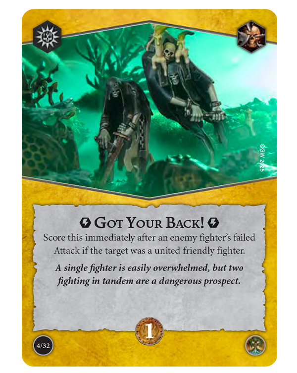 Staying united is key to scoring with Deadly Synergy. With Aggressive Unity, you just need to make three or more melee Attacks with united fighters, while Inevitable Outcome requires two or more united fighters to be adjacent to the same enemy fighter. You can score Got Your Back! if an enemy fighter’s failed Attack targeted a united fighter, and Outmuscle your opponents by driving back an enemy with a united fighter.