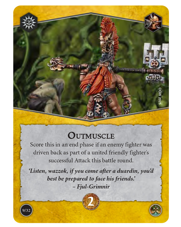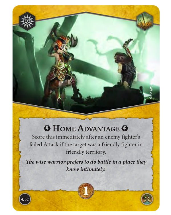 Objectives reward you for forcing enemies to Back Off! by pushing them out into a different territory, or by having your leader stick in your own territory and Attack twice, ensuring they Lead By Example. If you can coordinate things, Pinned! scores big when an enemy is driven into an edge hex in friendly territory, while Home Advantage nets you glory if an enemy fighter fails an Attack that targets a member of your warband in friendly territory.