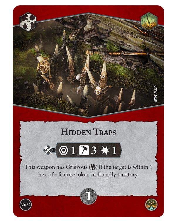 Other highlights include Keep Them at Bay, which adds +1 Range to a maximum of 2 for Attacks that target enemies in friendly territory, Mind Your Step, which lets you push an enemy fighter two hexes as long as they land in neutral or enemy territory, and the upgrade Hidden Traps, which provides a reliable weapon that gains Grievous when the target is near a feature token in your territory.