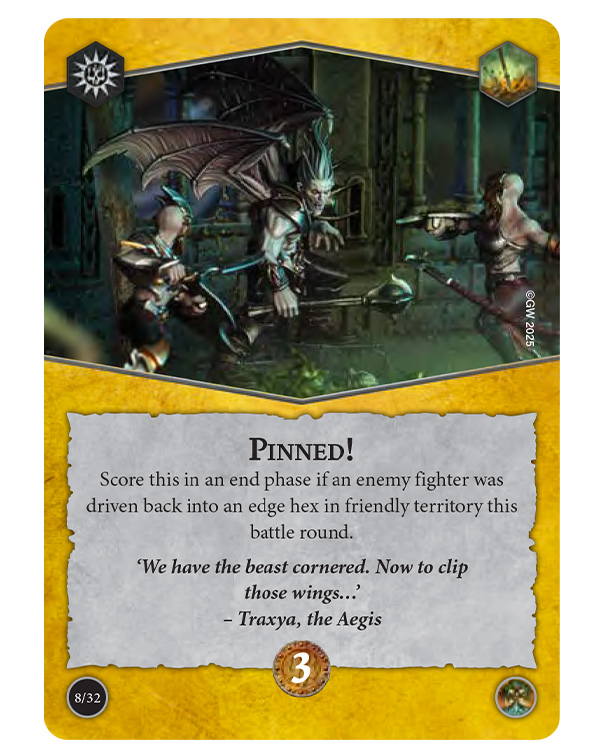 Score this in an end phase if an enemy fighter was driven back into an edge hex in friendly territory this battle round.