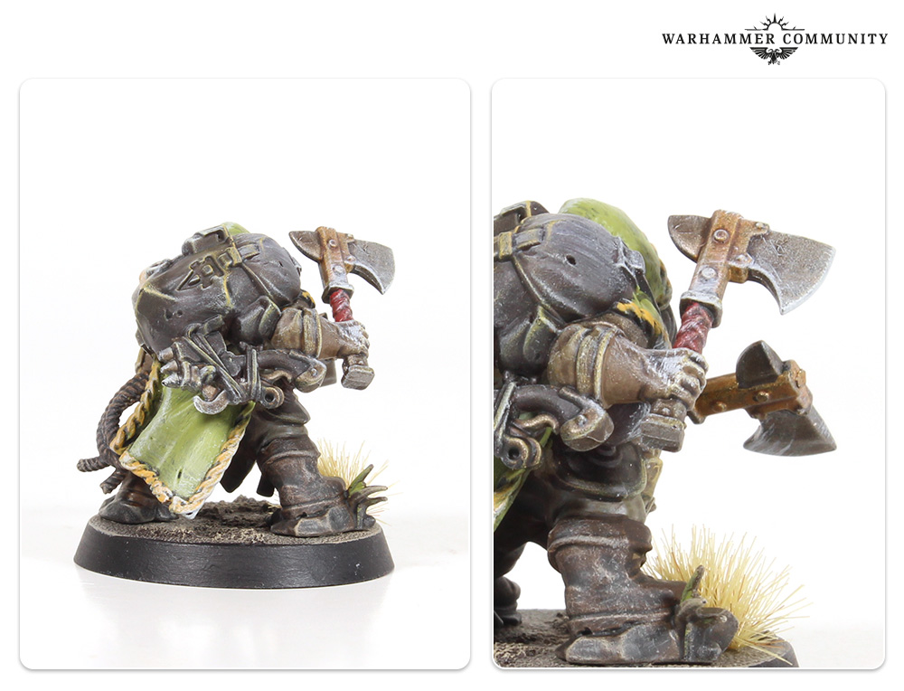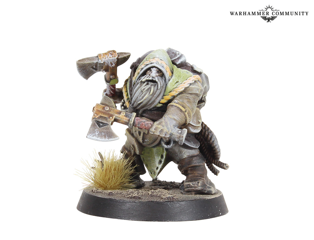 While I adore Drolf’s blue scheme from the box art, I thought he might struggle to blend into his forest home. So my grizzled explorer’s theme is inspired by the autumnal yellows and browns I can see outside my office window right now. I painted his cloak using Orruk Flesh and Averland Sunset, and his many fine leather accessories are a mixture of Rhinox Hide and Steel Legion Drab. A liberal amount of Agrax Earthshade helped him look like he hadn’t seen the inside of a bathtub in an age, and a few swipes of Corax White and Averland Sunset with an old dry makeup brush brought out all his lovely details.