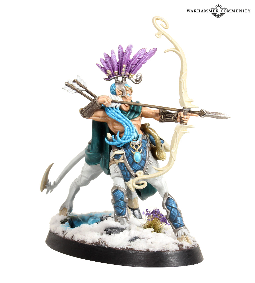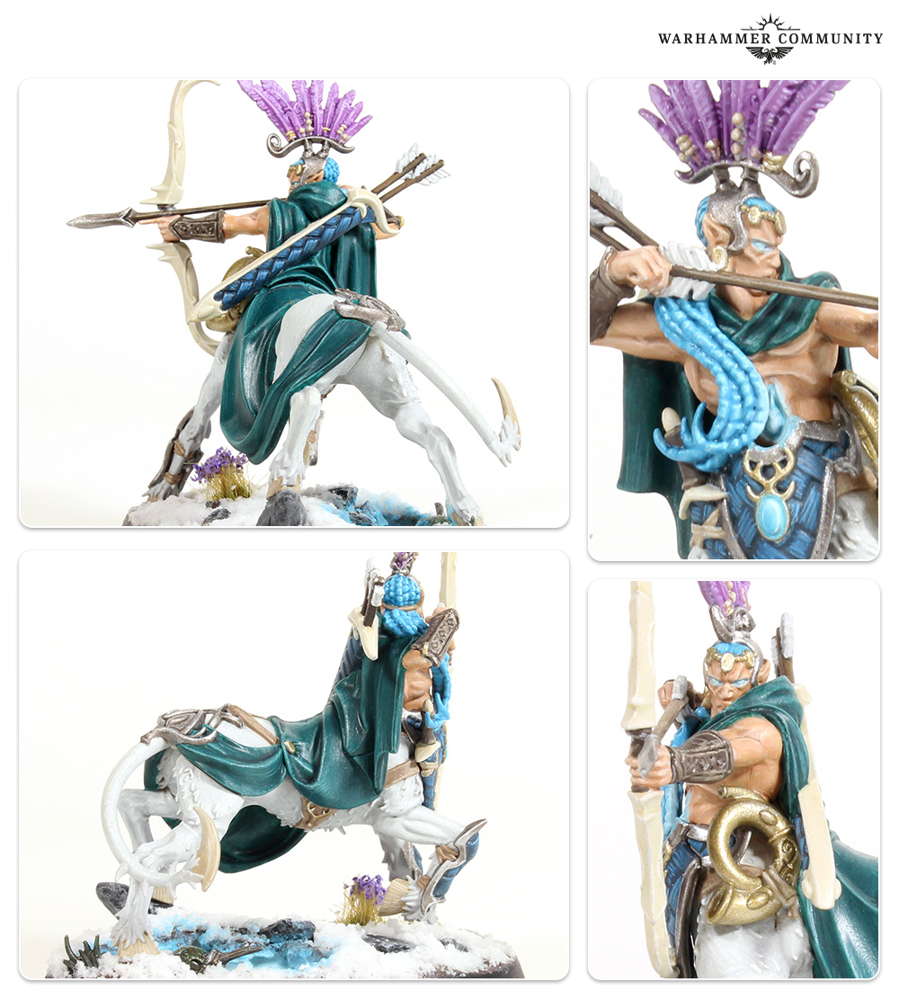 The animal portion of him was painted using Grey Seer spray as a base coat, layered up with Ulthuan Grey and a final highlight of White Scar. The skin was a 50/50 mix of Cadian Fleshtone and Kislev Flesh, with some darker and lighter blends. I used Lupercal Green for his cloak, being very careful not to get it on the white animal skin! The hair, gems, and other blue sections were based with Lothern Blue, highlighting up to Baharroth Blue to make it look more icy, in keeping with the winter theme.
