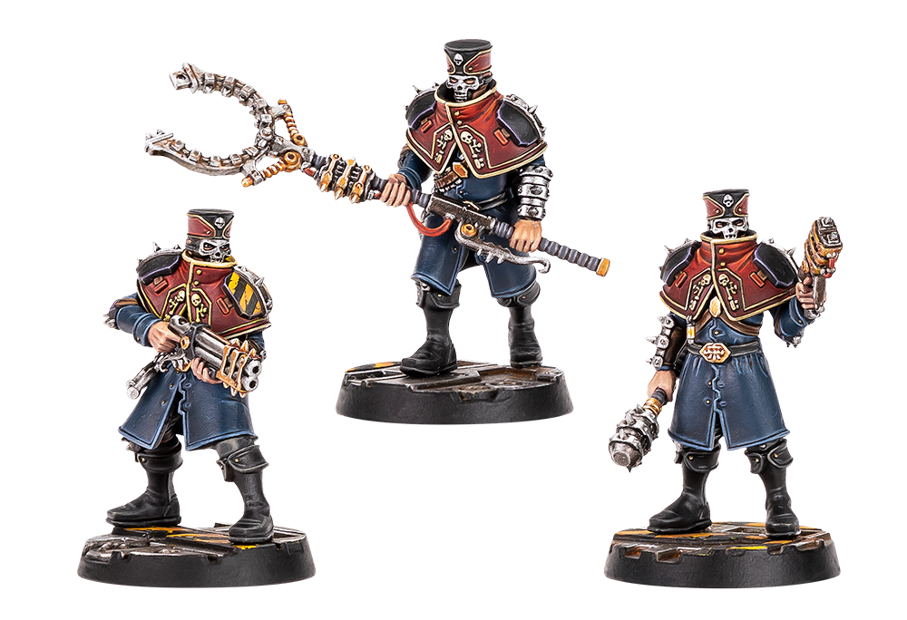 The Palanite Enforcers may mete out brutal justice against gangs in the streets of Hive Primus, but it is the Justicar Courts who pass judgement on renegade nobles and rogue heirs. When arriving in a region they will block off all entry and exit points, set up a tribunal, and quickly sentence their target to death before hunting them down. It is always a Magistrate that takes charge of a Justicar Delegation, joined by an executioner who ensures the sentence is complete. Three bailiffs ensure the guilty cannot escape, carrying Fulmen pattern man-catchers and shock pistols as their tools of justice.