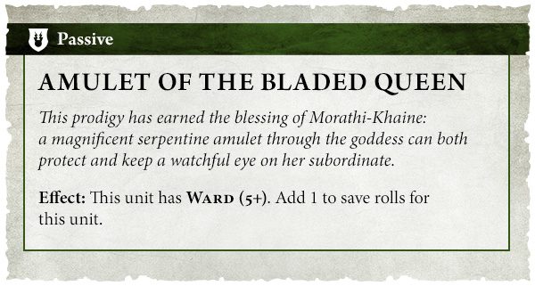 This prodigy has earned the blessing of Morathi-Khaine: a magnificent serpentine amulet through the goddess can both protect and keep a watchful eye on her subordinate.