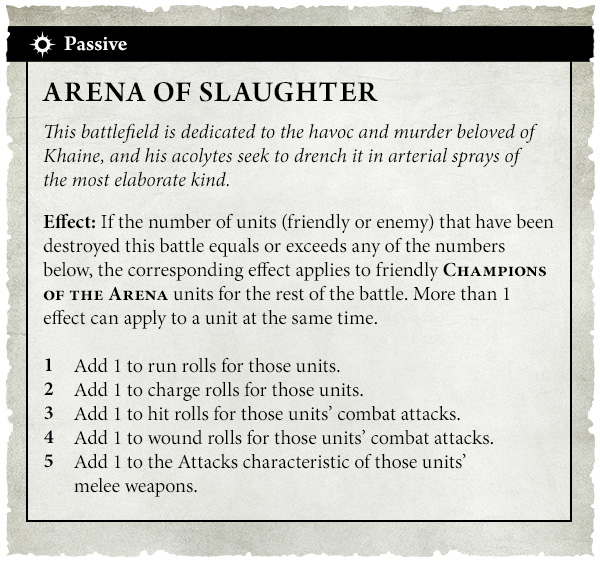 Effect: If the number of units (friendly or enemy) that have been destroyed this battle equals or exceeds any of the numbers below, the corresponding effect applies to friendly CHAMPIONS OF THE ARENA units for the rest of the battle. More than 1 effect can apply to a unit at the same time.