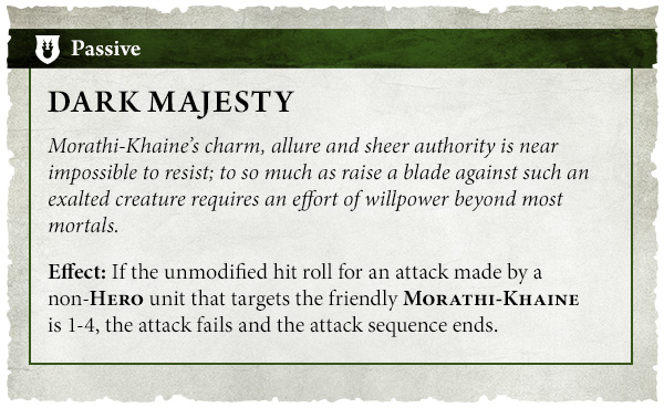 Effect: If the unmodified hit roll for an attack made by a non‑Hero unit that targets the friendly Morathi‑Khaine is 1-4, the attack fails and the attack sequence ends.