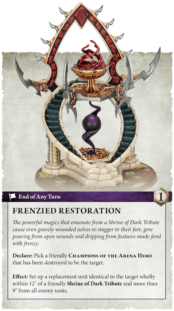 Khaine cares not from where the blood flows!* If your army is successful in the arena, you’ll be super empowered to hunt down the last dregs of your enemy, while if your foe has gotten the better of you, your survivors will be ready for a glorious last stand. Should one of your Heroes find themselves bested in the arena, they can even be reborn in blood with a Frenzied Restoration.