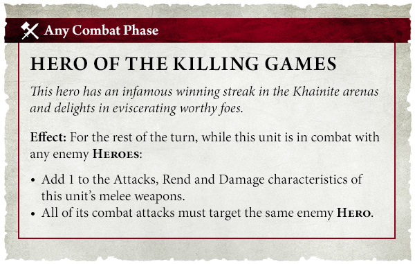 If you have a fighter celebrated across the Mortal Realms for their skills, the heroic trait Hero of the Killing Games would be ideal.