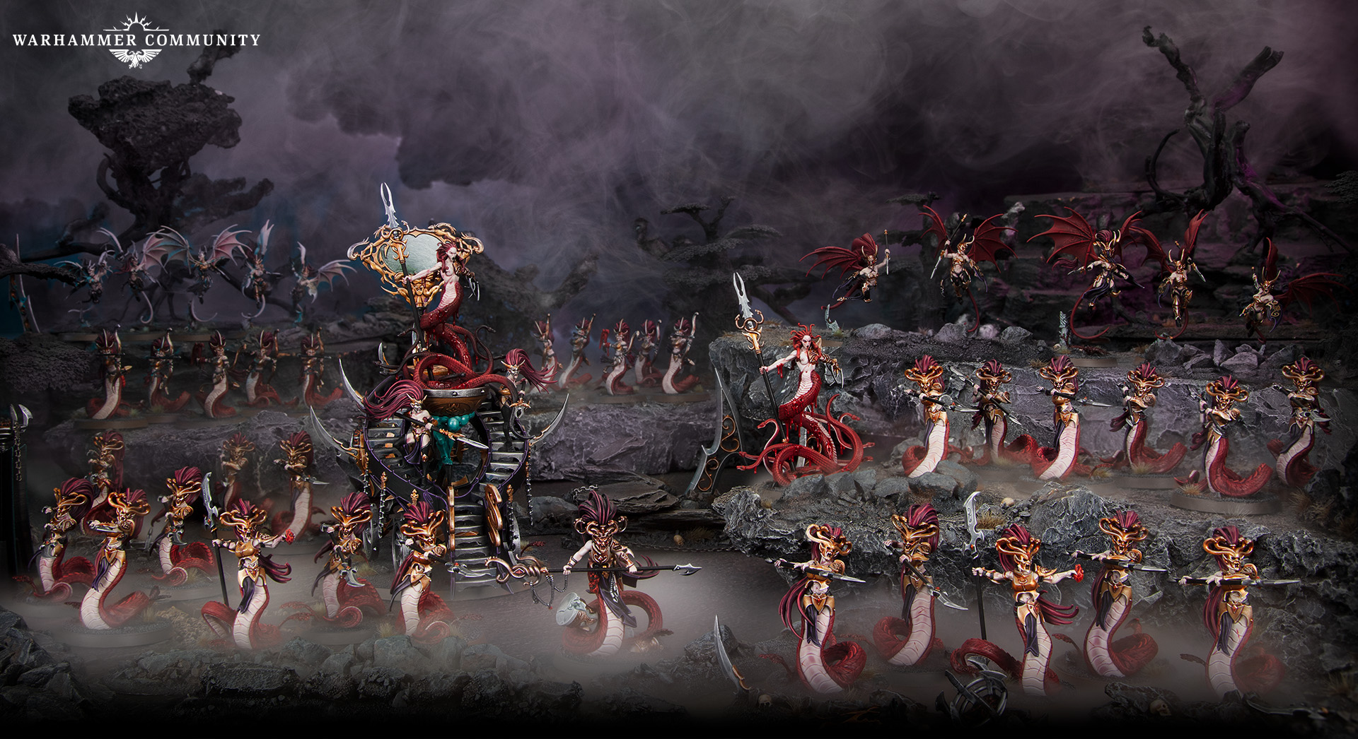 The army can include Melusai Ironscales, Blood Sisters, Blood Stalkers, Khinerai Heartrenders, Khinerai Lifetakers, Bloodwrack Medusae, and Bloodwrack Shrines, but MUST be led by Morathi-Khaine and the Shadow Queen. While in command, Morathi can use her Dark Majesty to ensure that lesser creatures find themselves flailing ineffectually in her presence.