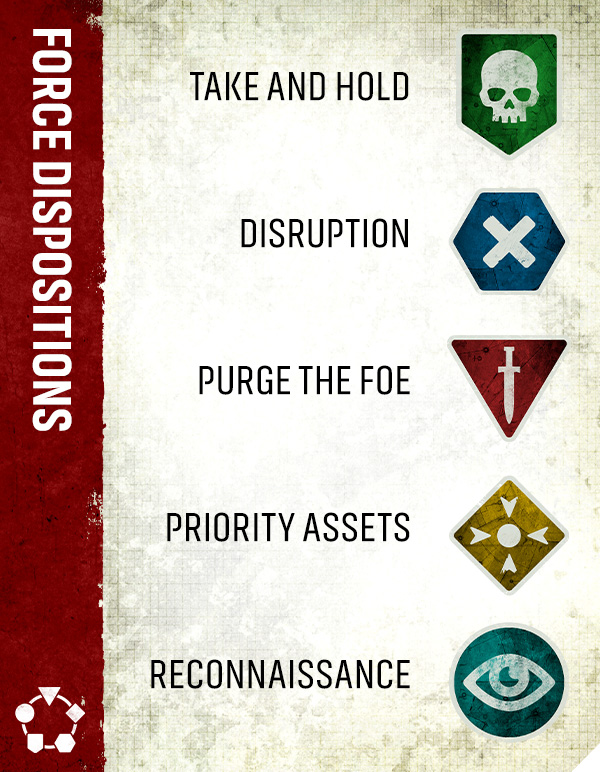 Each Force Disposition is geared towards thematic mission objectives, so an army choosing Purge the Foe will often score Victory Points for wiping out enemy units, while one opting for Disruption might need to perform actions in enemy territory or while occupying crucial areas of terrain.*