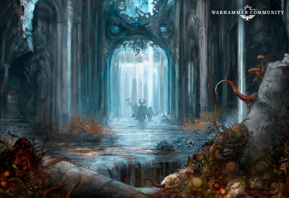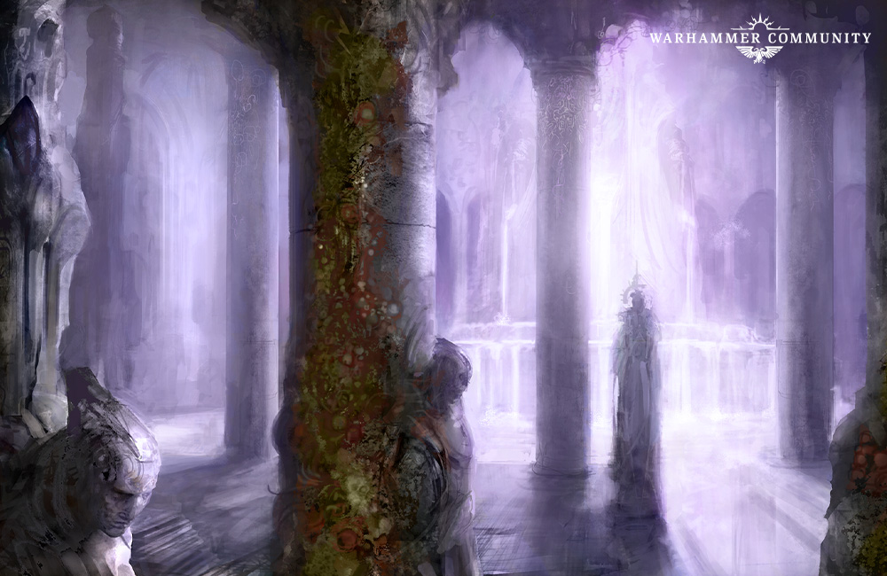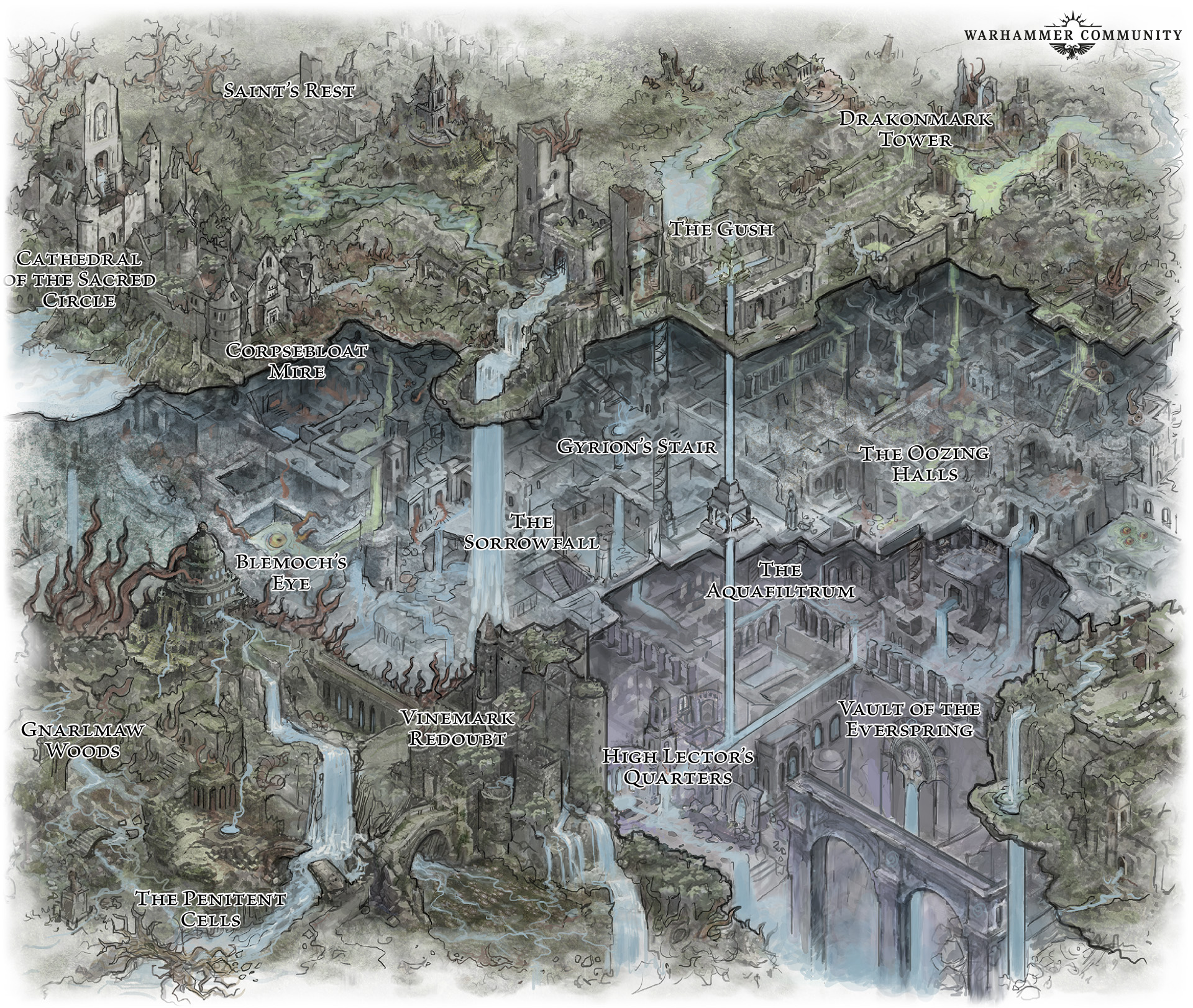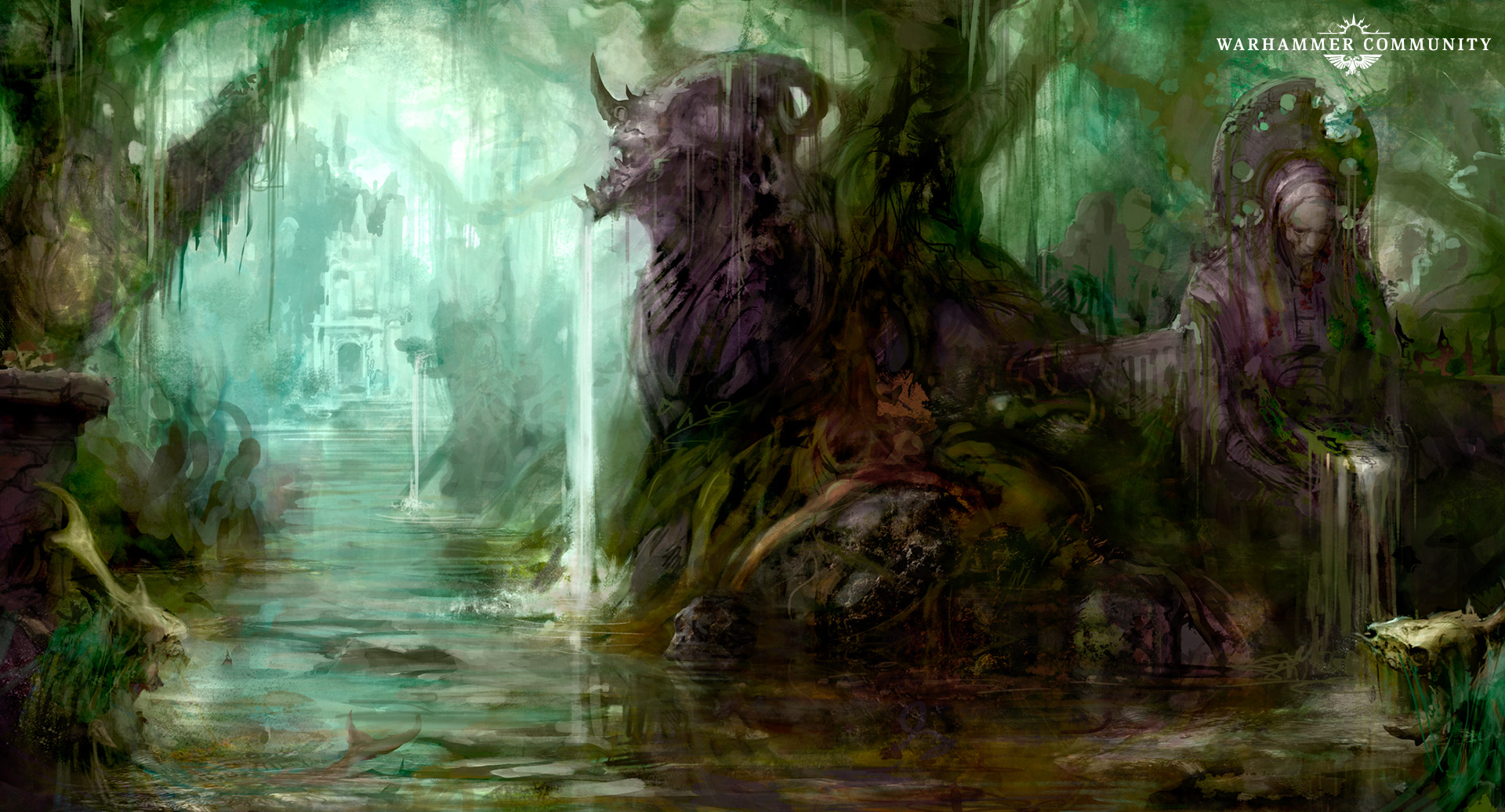 Everything begins with the Everspring, a font of crystal-clear water blessed by Alarielle the Everqueen. This sacred liquid is essentially supercharged Aqua Ghyranis – one swig and any mortal illness is cured, any wound healed without a scar, and with regular administrations one can achieve a sort of immortality. More than just providing a five-star spa day, the Everspring is a vital artery of life energy for Ghyran, even giving the Everspring Swathe its name.*