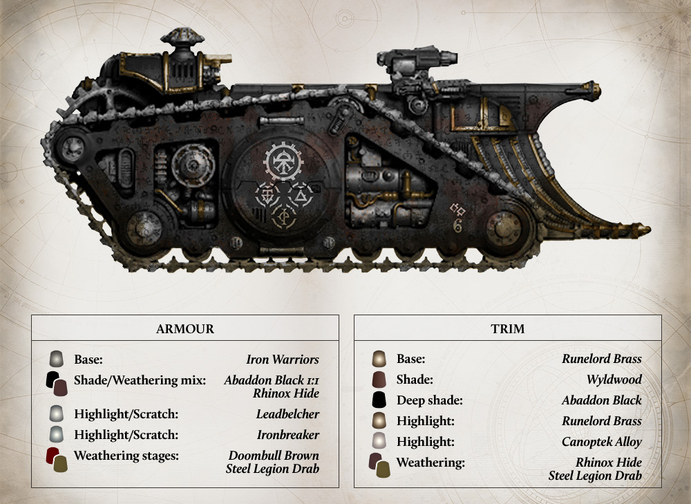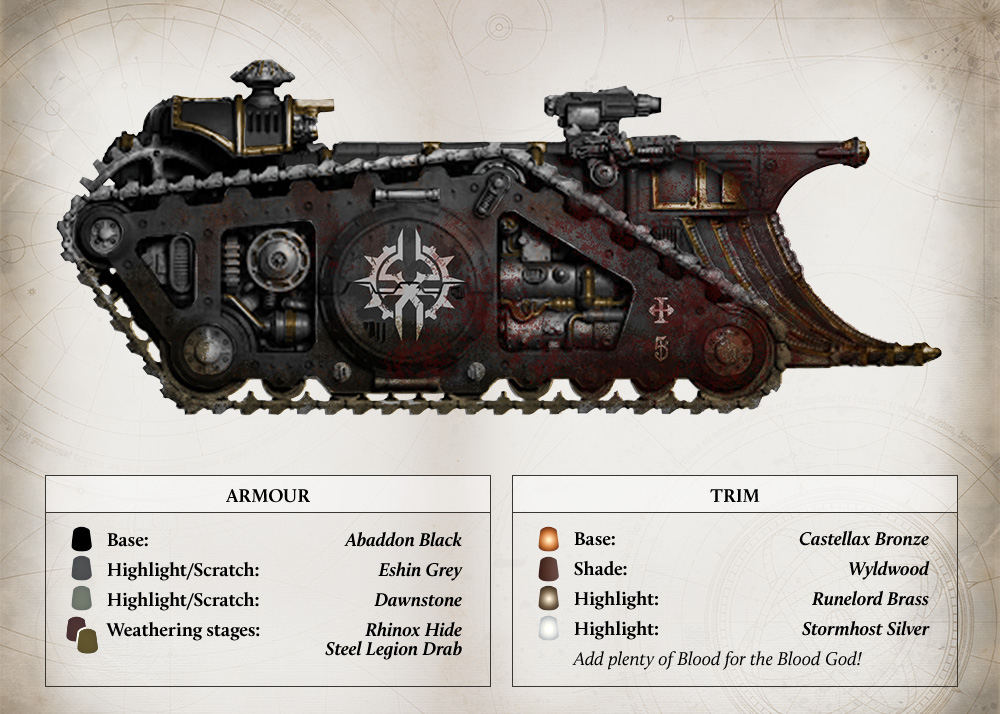 (Above) A Triaros Armoured Conveyor dedicated to the entity known to followers as Khorne. The armour is black with brass banding, and the vehicle's flanks have been drenched with spilled blood.