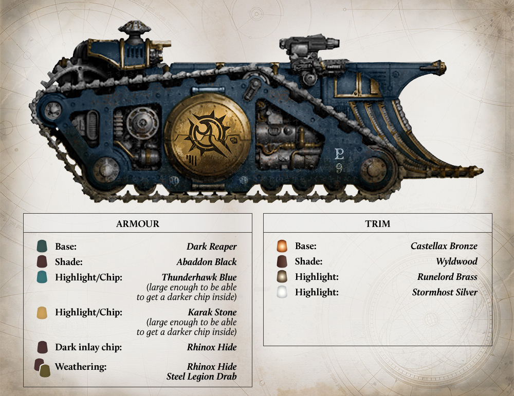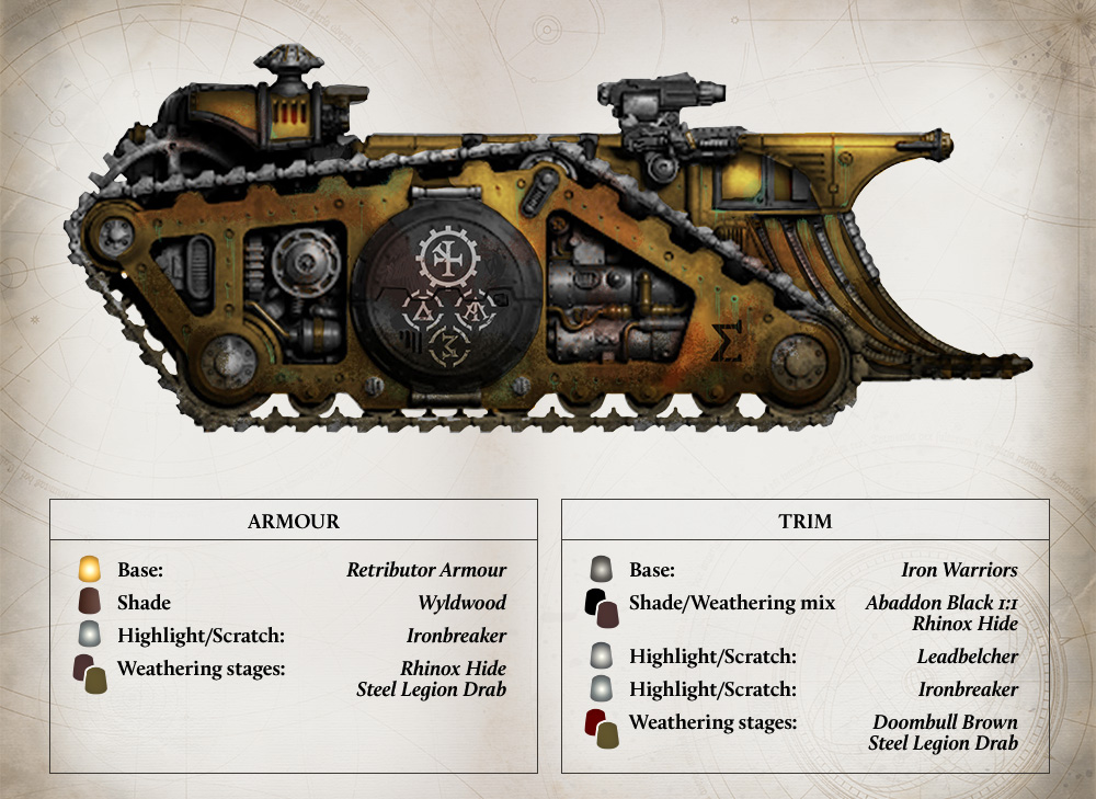 Another way to determine what colour scheme a vehicle might bear is to consider if it might have been dedicated to the service of a particular Ruinous Power (i.e. the Chaos Gods Khorne, Nurgle, Tzeentch, and Slaanesh). This opens up the use of colours not normally seen in Mechanicum armies, such as greens and blues (appropriate to Nurgle and Tzeentch respectively). Schemes such as these are more appropriate for use towards the end of the Horus Heresy, when the individual identities of the Chaos Powers so well established by the time of the 41st Millennium are only just beginning to appear.
