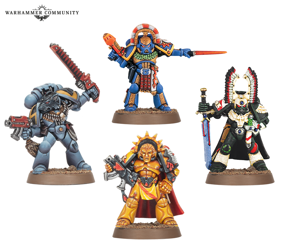 First up, you’ll be able to pick up a set of four metal Captains from the Ultramarines, Space Wolves, Dark Angels, and Blood Angels Chapters, bristling with iconography. Following them is a set of three metal and resin characters in Terminator armour – a Captain, Librarian, and Chaplain – and a pair of plastic Terminator Librarians to complete the gang.