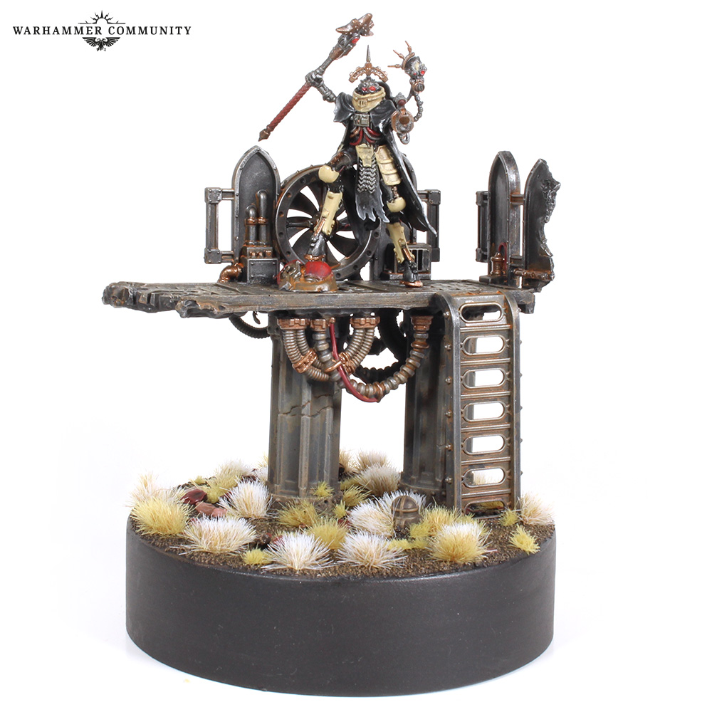 I love creating interesting bases so much that I often decide what bases I want to do before choosing the army to go with them, and having the chance to paint up the Skitarii Marshall was the perfect opportunity to combine my basing enthusiasm with my favourite Forge World’s colour scheme. I used a spare lid as a display plinth, applied two of the medium pillars from the Sector Imperialis Ruins set, and chopped up a spare floor part from the Manufactorum set to make a walkway. A few Sector Mechanicus details really flesh it out.